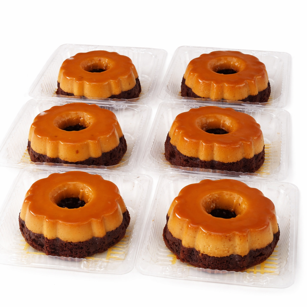 Postre individual de chocoflan en presentación mini, compuesto por dos capas bien definidas. La capa superior es un flan de textura suave y cremosa, con acabado liso y cubierto de caramelo líquido de tono ámbar brillante. La base consiste en un bizcocho de chocolate húmedo y compacto, que aporta contraste en textura y sabor. Cada pieza tiene forma acanalada con centro abierto y se presenta en envase individual transparente que conserva su estructura y frescura.